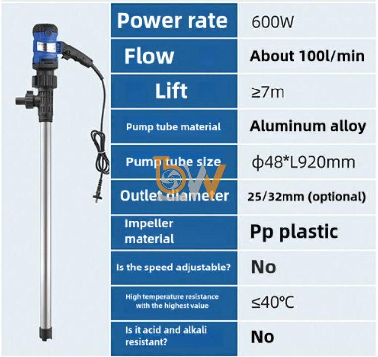 Ống bơm và chân bơm được thiết kế để ngâm trực tiếp trong chất lỏng như dầu, dung môi, axit hoặc kiềm.