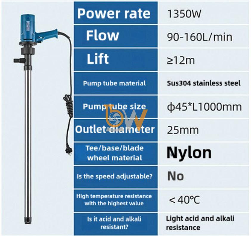 Vận hành Bơm điện hút thùng phuy JDT-1350W-SUS304N trong môi trường hóa chất nhẹ cần tuân thủ đúng quy trình để đảm bảo an toàn, hiệu suất và độ bền thiết bị. Với vật liệu inox SUS304, bơm phù hợp với các dung dịch có tính ăn mòn nhẹ nếu sử dụng đúng cách.