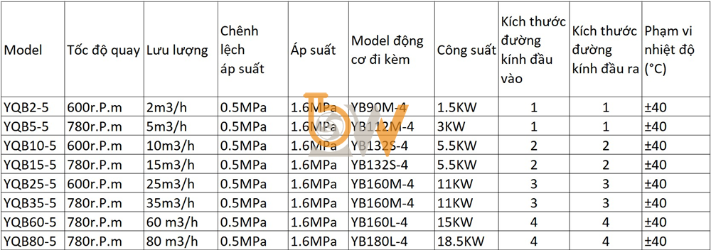 Bảng thông số kỹ thuật của Bơm khí hóa lỏng loại YQB