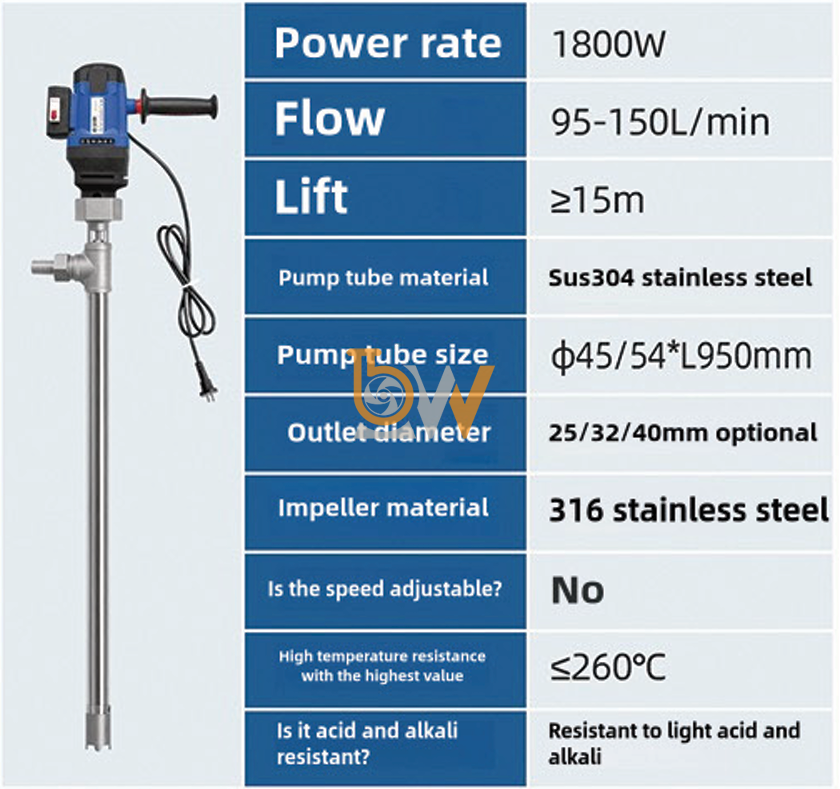 Thông số Bơm thùng phuy lỏng nhiệt độ cao JDT-1800W-G260