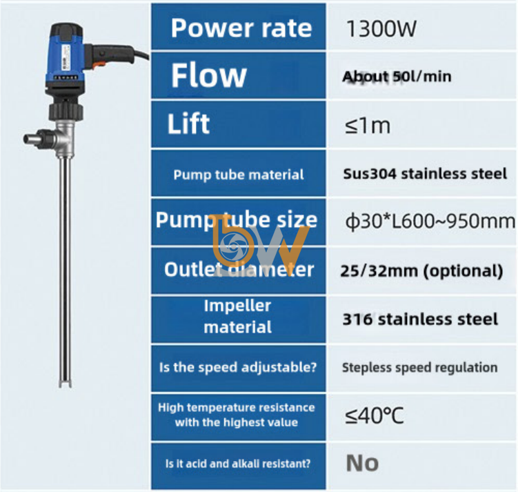 Nguyên lý hoạt động của dòng Bơm thùng phuy JDT-1300W-30 SUS304 được xây dựng dựa trên cơ chế hút – đẩy liên tục theo trục đứng, tối ưu riêng cho việc chiết rót chất lỏng từ thùng phuy. Thiết kế này giúp bơm vận hành ổn định, dòng chảy đều và khai thác gần như triệt để lượng chất lỏng trong thùng.