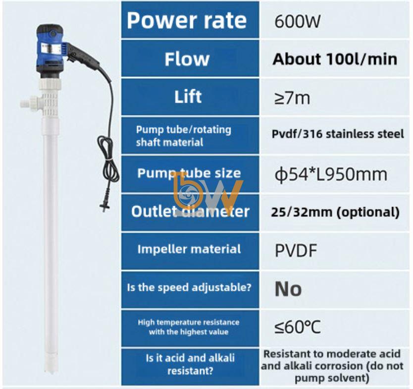 Máy bơm thùng phuy cắm điện JDT-600W-PVDF sử dụng động cơ điện công suất 600W được thiết kế chuyên biệt cho hoạt động liên tục và ổn định trong môi trường công nghiệp.