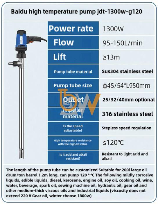 Để đạt hiệu suất cao khi bơm chất lỏng nhiệt độ cao, bơm thùng phuy nhiệt độ cao JDT-1300W-G120 được thiết kế theo nguyên lý chuyển hóa năng lượng nhiều cấp, từ điện năng → cơ năng → thủy năng, với tổn thất được kiểm soát chặt chẽ.
