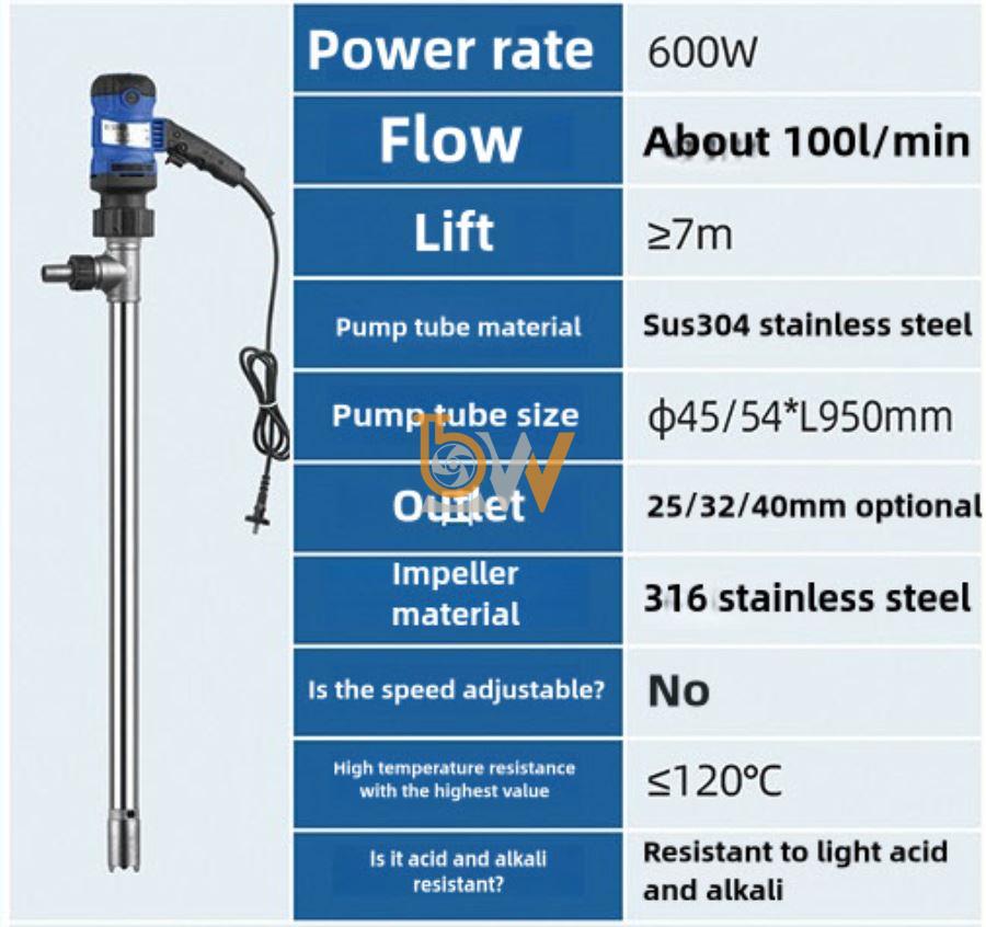 Bơm thùng phuy nhựa RPP JDT-G120-600W được trang bị động cơ 600W, đây là mức công suất được nghiên cứu để đáp ứng đa số nhu cầu bơm hóa chất trong công nghiệp mà vẫn đảm bảo tiết kiệm điện.