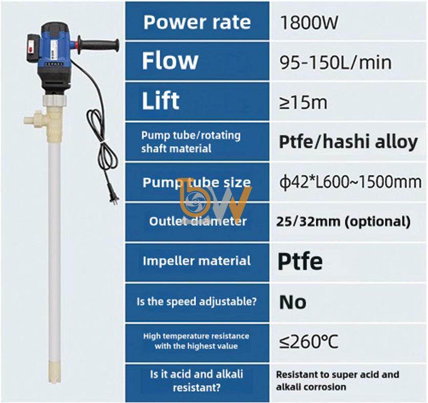 Trong Bơm điện thùng phuy 200L JDT-1800W-PTFE, khớp nối được thiết kế chuyên dụng để phù hợp với tốc độ quay cao và môi trường hóa chất.