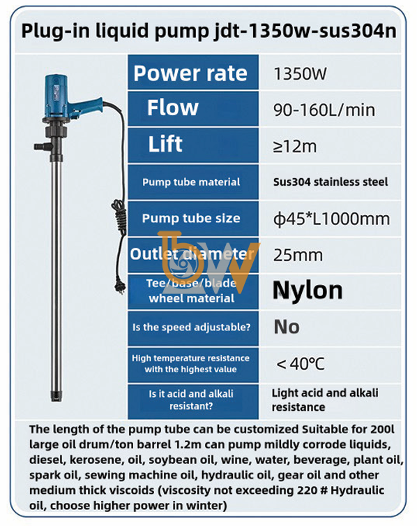 Máy bơm JDT-1350W-SUS304N có thể bơm nhiều loại chất lỏng, bao gồm dầu thủy lực, dầu mỡ, nước và các hóa chất nhẹ. Tuy nhiên, cần đảm bảo rằng máy bơm không phải bơm các chất lỏng có tính ăn mòn mạnh hoặc chất lỏng có độ nhớt quá cao mà máy bơm không được thiết kế để xử lý.