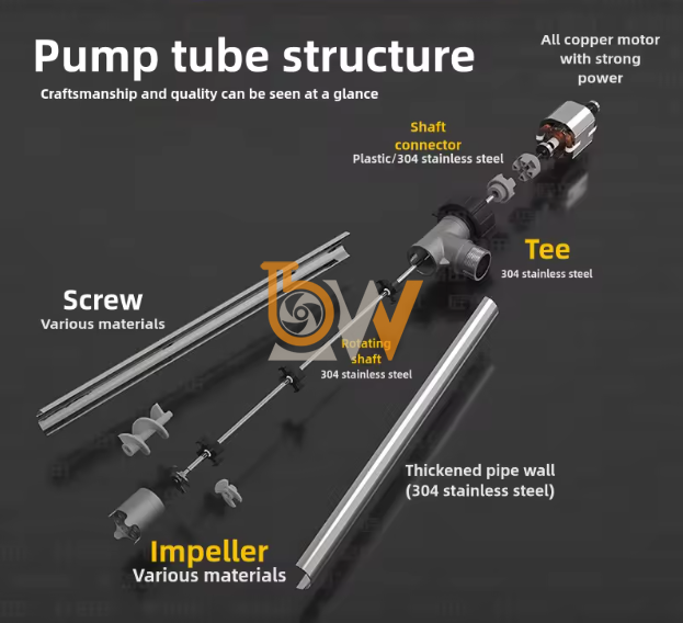 Sau khi khởi động, cánh bơm tạo ra chênh lệch áp suất để hút chất lỏng từ bên trong thùng chứa vào ống bơm. Với kích thước ống Φ45/54 × L950mm, có thể tùy chỉnh chiều dài, máy dễ dàng tiếp cận phần chất lỏng trong thùng phuy lớn và duy trì quá trình hút tương đối đều trong suốt thời gian vận hành.