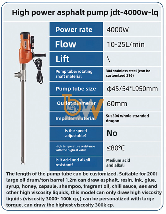Thông số Bơm nhựa đường cầm tay hút từ thùng phuy JDT-4000W-LQ