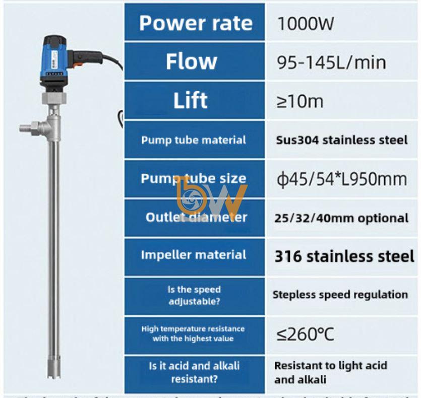 Máy bơm thùng phuy inox SUS304/316 JDT-1000W-G260 hoạt động theo nguyên lý cánh bơm ly tâm, giúp bơm hóa chất nhanh, ổn định và an toàn, vượt trội hơn so với cơ chế trục vít trong các ứng dụng bơm chất lỏng loãng và dung môi công nghiệp.